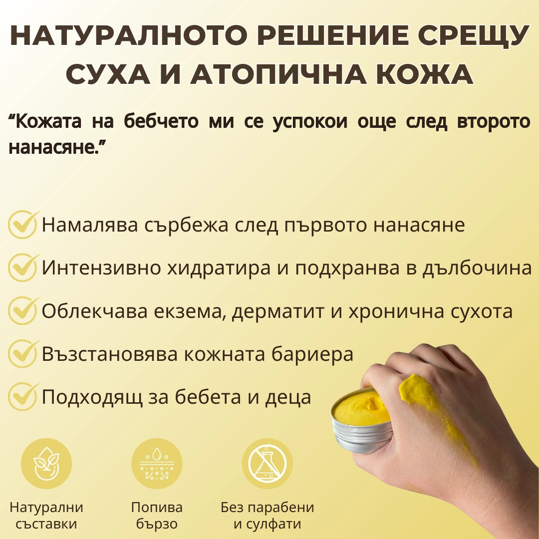 Още от първото нанасяне усещането за сърбеж и дискомфорт намалява, а кожата започва да се усеща по-мека и хидратирана. Възстановяващите свойства на натуралните съставки подпомагат облекчаването на зачервяванията и раздразненията, като същевременно създават защитна бариера срещу външни дразнители.